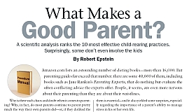 But the study produced some surprises too. For example, two practices that help to produce good outcomes with children don't even involve the children. ![]() The first practice is stress management: children turn out better when their parents know how to manage stress. Parents who don't know how to manage stress presumably get upset a lot, and they probably let their children upset them too. That can turn small issues into big issues and small conflicts into big conflicts. But here's the bad news: although stress management ranked high in producing good outcomes with children, it ranked rock bottom among the parenting skills parents actually have. A second practice that produces good outcomes with children concerns the relationship between the parents: children turn out better when their parents know how to get along with each other. Conflict between parents is very disturbing to children. Again, however, parents rated relatively poorly in this area. Other notable findings in the new study: 1) Men and women are nearly equal now in their parenting ability. 2) Gays amd straights also score about the same. 3) Divorced parents do as well as married parents. 4) A concern with safety (think "helicopter parenting"?) produces mixed results: somewhat better health, but a poorer relationship between parent and child. Roughly in order of importance (with the most important first), here are ten important parenting practices, which Dr. Epstein calls "The Parents Ten": The Parents Ten 1. Expressing Love and Affection: You support and accept the child, are physically affectionate, and spend quality one-on-one time with him or her. 2. Stress Management: You take steps to reduce stress for yourself and your child, practice relaxation techniques, and promote positive interpretations of events. 3. Relationship Skills: You maintain a positive marital relationship and model effective relationship skills with other people. 4. Autonomy and Independence: You treat your child with respect and encourage him or her to become self-sufficient and self-reliant. 5. Education and Learning: You promote and model learning for your child. 6. Life Skills: You provide for your child, have a steady income, and plan for the future. 7. Behavior Management: You make extensive use of positive reinforcement and punish only when other methods of managing behavior have failed. 8. Health: You model a healthy lifestyle and good habits for your child. 9. Religion: You support spiritual or religious development and participate in spiritual or religious activities. 10. Safety: You take precautions to protect your child and maintain awareness of the child's activities and friends. "The Parents Ten" is copyright 2010, Dr. Robert Epstein. A technical summary of the research is available here, and a feature article describing the research in Scientific American Mind can be accessed here. Information about Dr. Epstein's recent book on teens, Teen 2.0: Saving Our Children and Families from the Torment of Adolescence, can be accessed here. You can take the test that was used in the study at http://MyParentingSkills.com. Other tests of possible interest: http://TeenParentingSkills.com http://HowInfantilizedAreYou.com http://ExtendedChildhoodDisorder.com http://MyRelationshipSkills.com http://MyStressManagementSkills.com